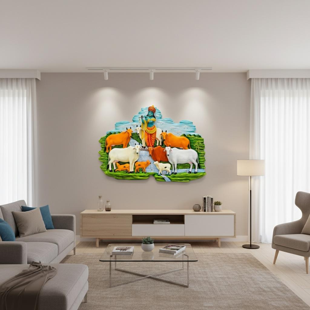 Bring peace, devotion, and traditional charm into your home with this beautifully crafted Krishna with Sacred Cows Wall Art. Featuring Lord Krishna standing gracefully among cows in a lush pastoral setting, this artwork symbolizes divinity, compassion, prosperity, and harmony.
