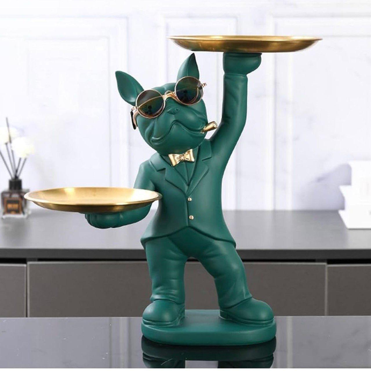ITALIAN BULLDOG DOUBLE TRAY HOLDER - Teal Green / Polyresin / H: 12 | L: 7.5 | W: 7 (Inch)