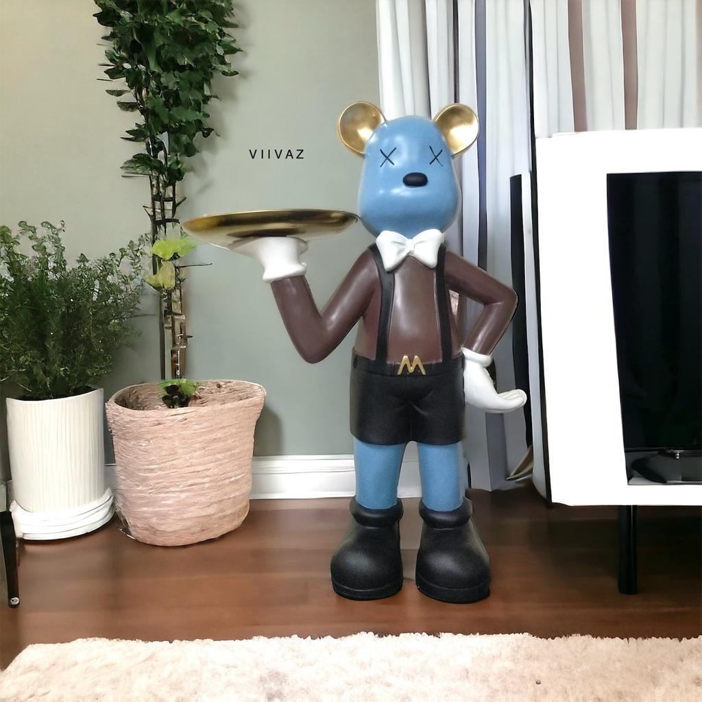 The tray holder, seamlessly integrated into the teddy's design, adds a functional dimension to the sculpture. It provides a convenient spot to place items like keys, jewelry, or small decor pieces, making it not only an eye-catching centerpiece but also a useful home accessory. The juxtaposition of the playful Kaws Companion with the functionality of the tray holder creates a dynamic and intriguing conversation piece that can spark discussions about the intersection of art and utility in modern design.