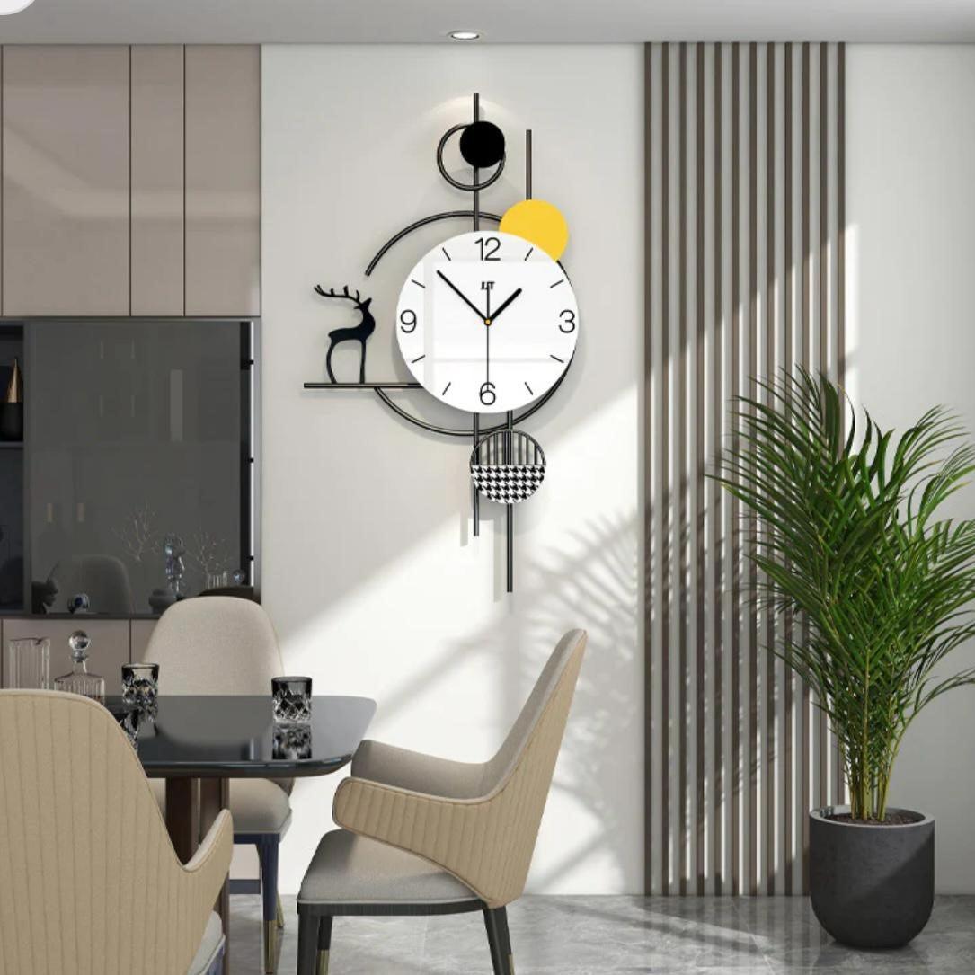 This clock is a stunning decor piece that seamlessly integrates artistic expression with functional timekeeping. At its core, a meticulously crafted clock takes center stage, adding a practical and sophisticated touch to the overall aesthetic. The clock's design is a harmonious blend of modernity and elegance, with bold numerals and sleek hands contributing to its timeless appeal.