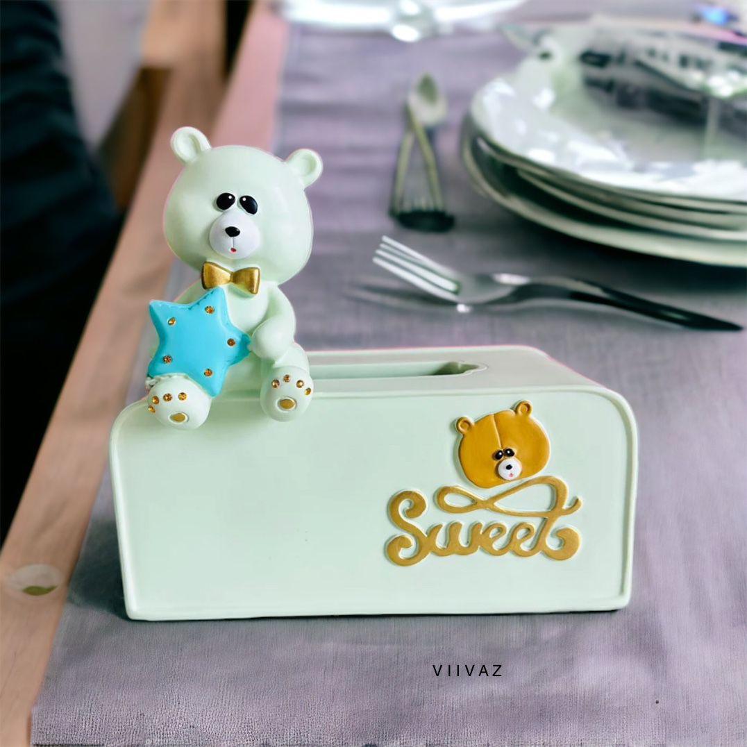 Teddy Tissue Holder - Mint Green / Polyresin | Gloss Finish / H: 9 | L: 9 | W: 5 (Inches)