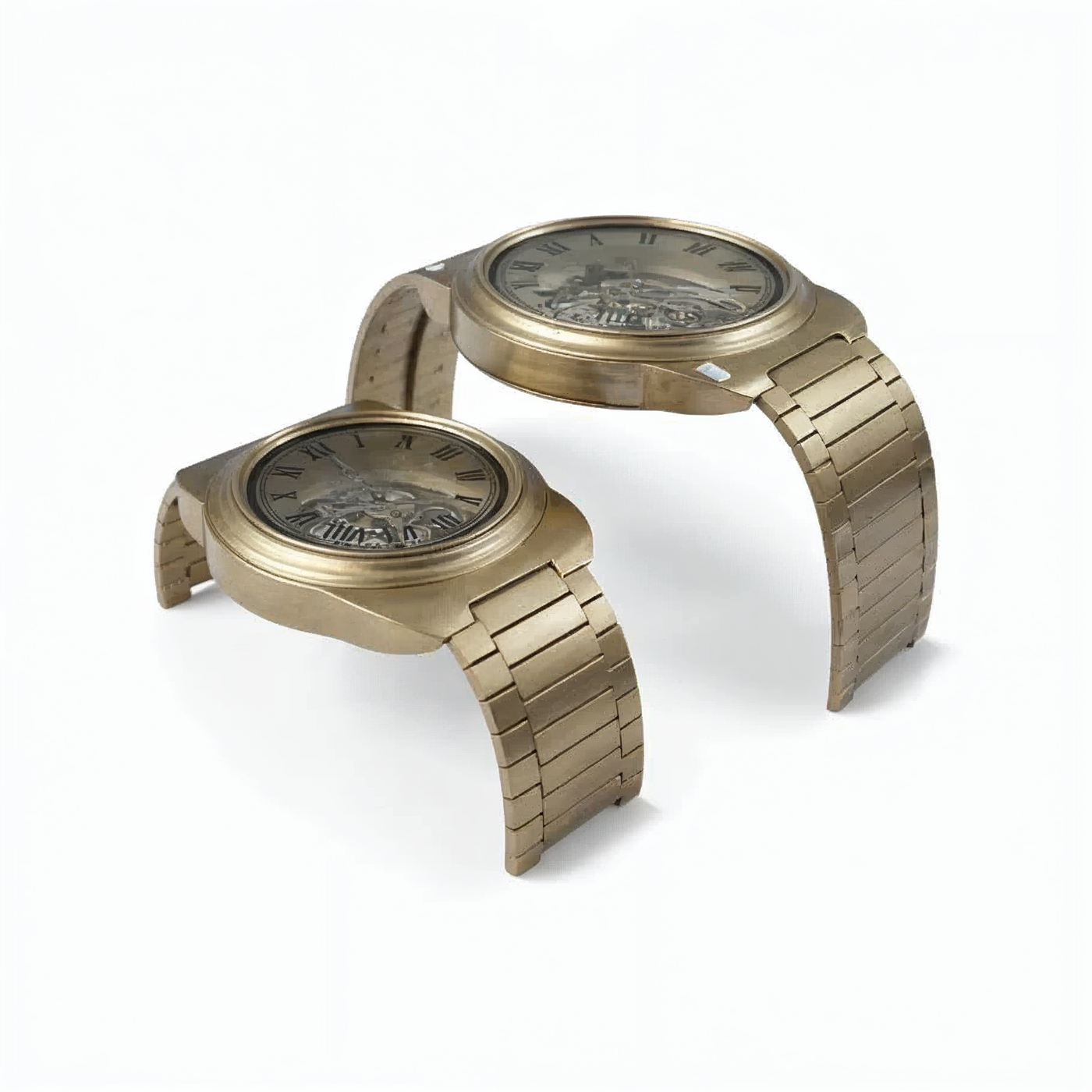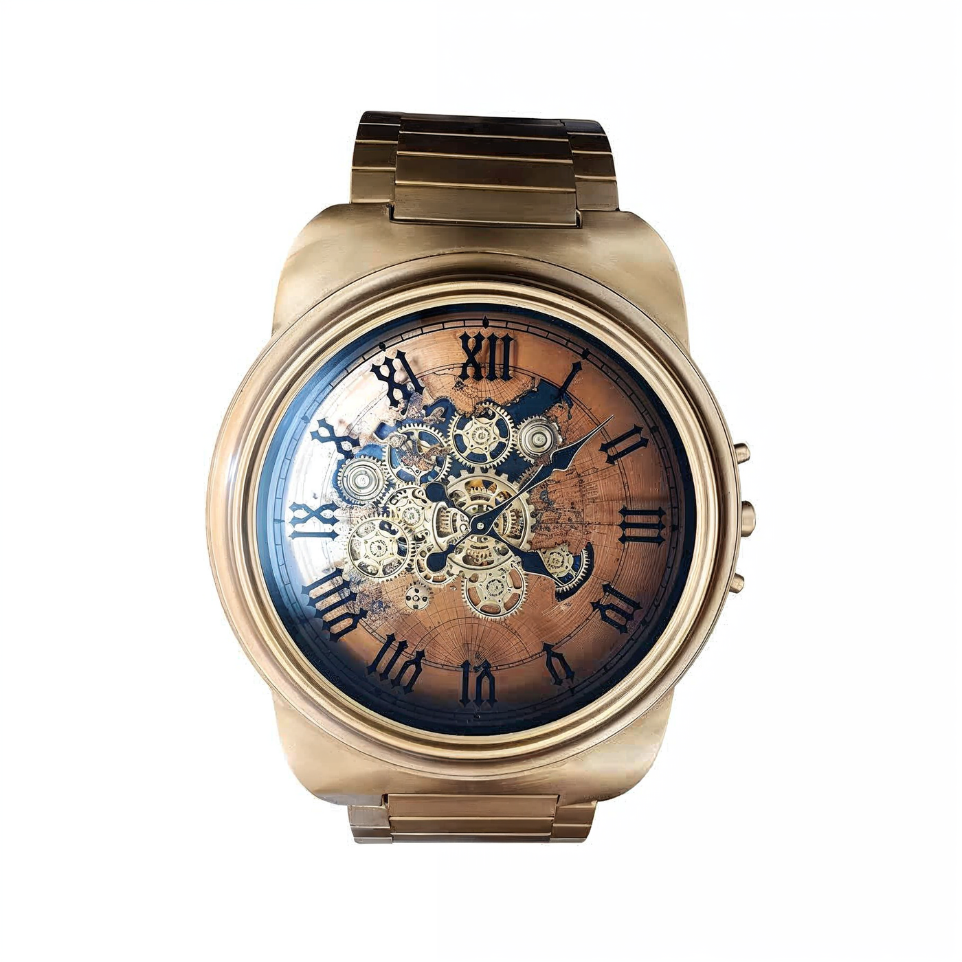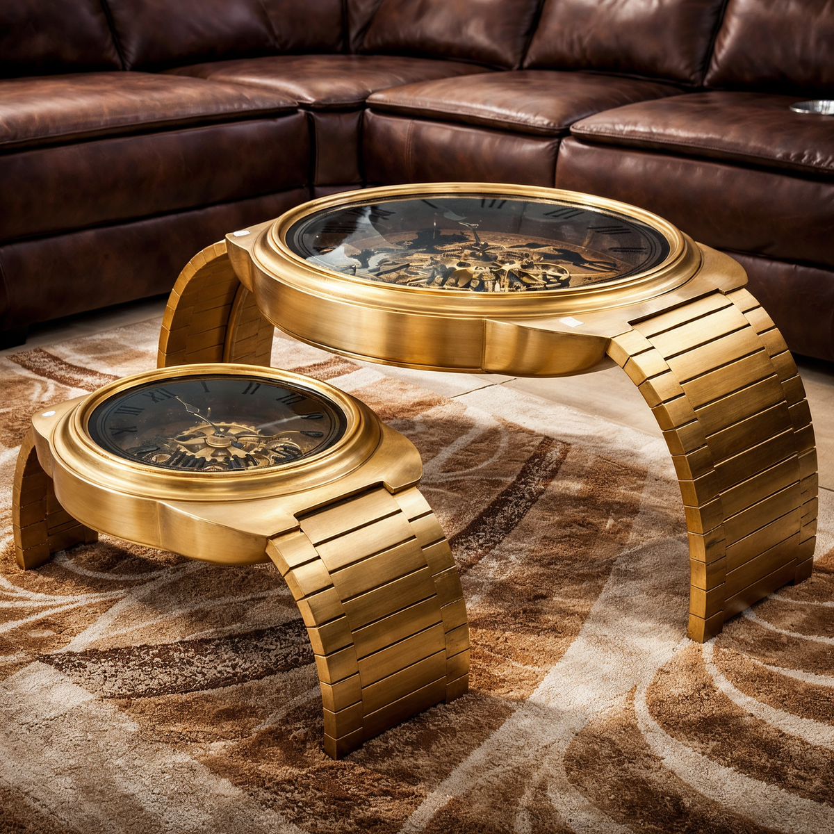 A captivating centerpiece table that combines antique elegance with industrial style. With visible bronze gears under a glass surface, its working clock face adds a touch of classic sophistication and mechanical beauty to any room.