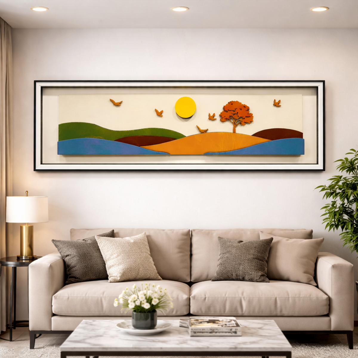 Modern 3D Layered Landscape Glass Frame Wall Art - Sunset & Nature Theme
