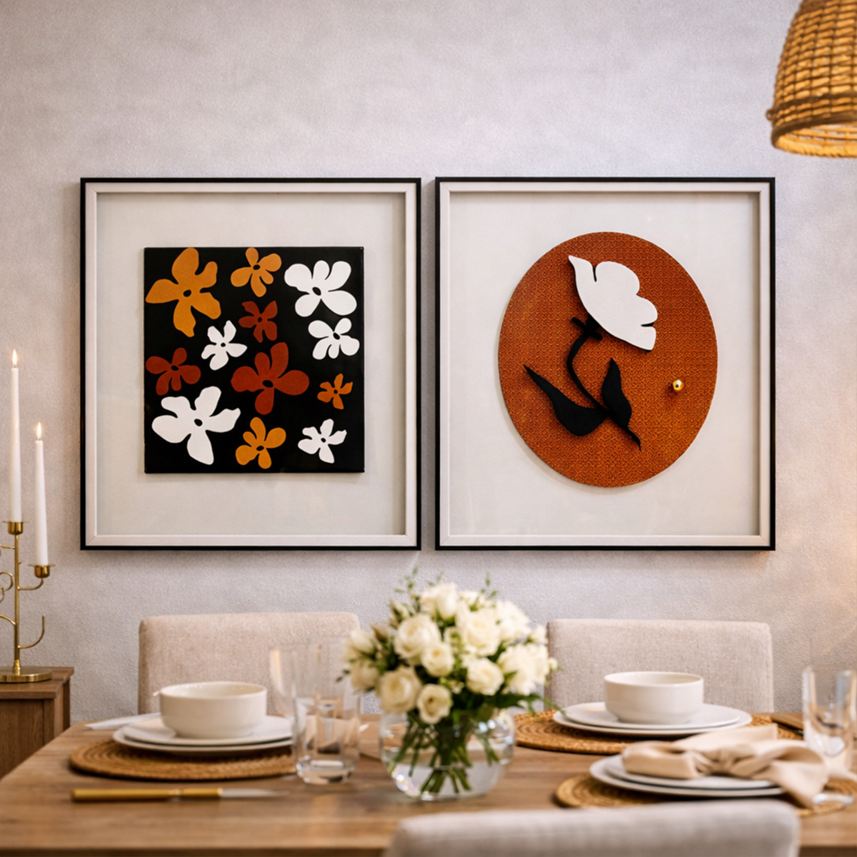 This artistic pair features bold floral motifs paired with a minimalist botanical form, creating a striking visual balance. The contrasting shapes and earthy tones add depth and elegance, making the artwork feel modern yet warm. Together, they bring a refined decorative accent to any space.